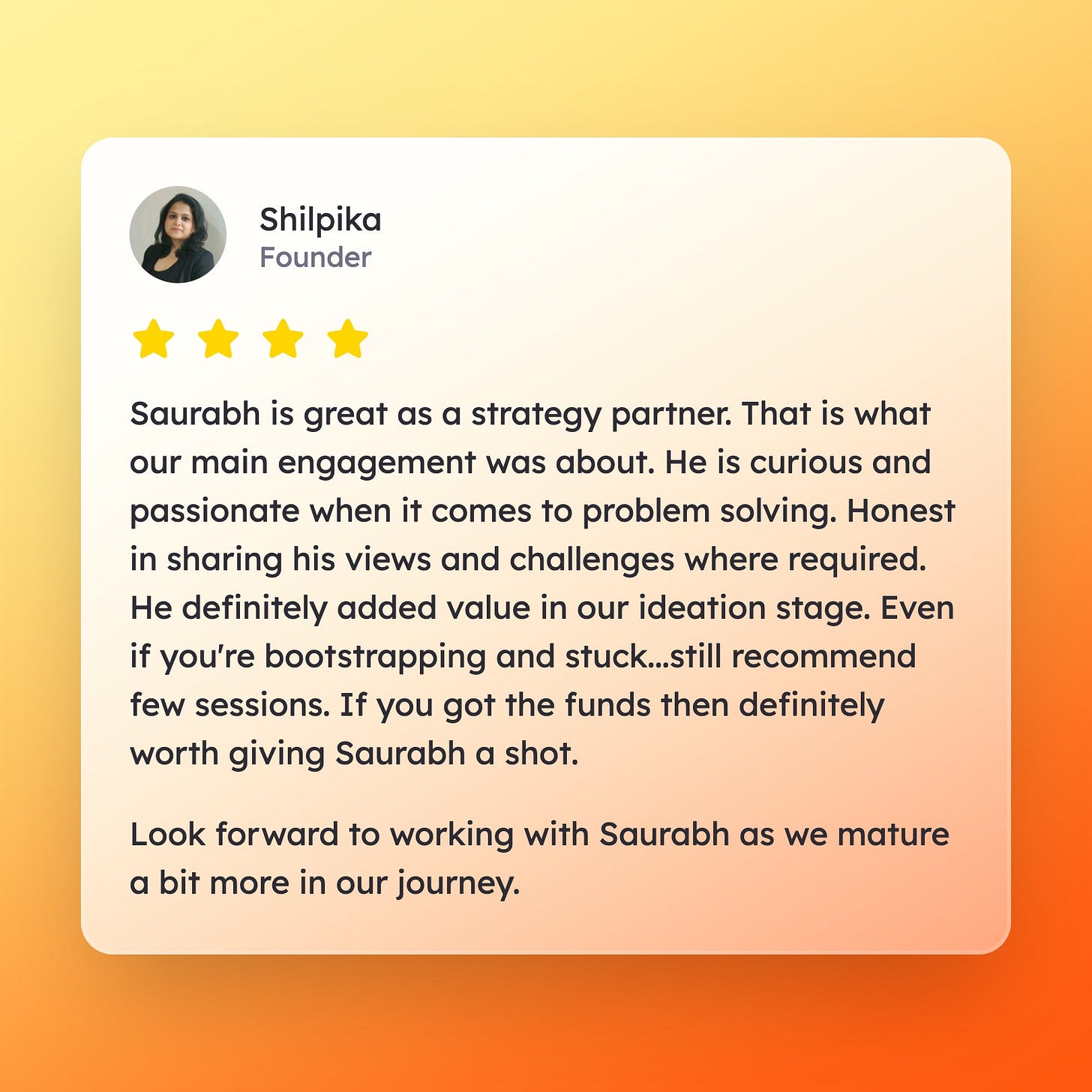 Note from me: Startups complain that experienced Fractional CMOs charge a lot and often it's not possible for bootstrapped startups to afford CMOs with experience. Thus in the initial stages when startups really need people who understand both strategy and tactics,they have to go without that talent and end up paying a much higher cost then (in terms of unnecessary media spend,focussing on the right things etc) and then more down the line when the mistakes have possibly scaled. It's a real problem and because of that I am trying a new model which costs 300$, and to start off less than 100$ (sharing a review below) . However before I go into details of this I would want to hear from startup founders and VCs what is the real,tangible problems they face which hiring fractional marketing or strat talent. Ping me or comment below.